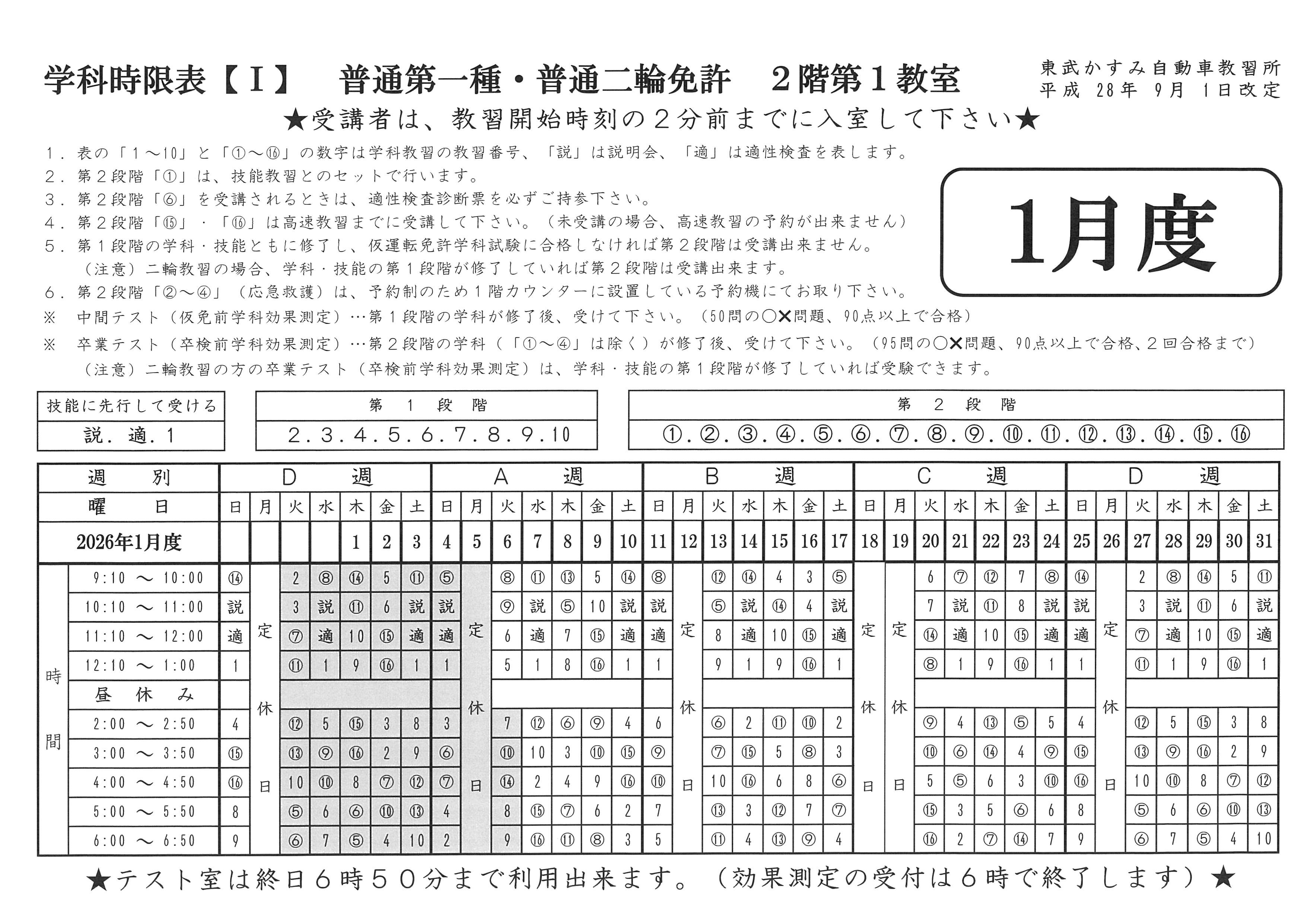 2026年 1月 2月 学科時限表