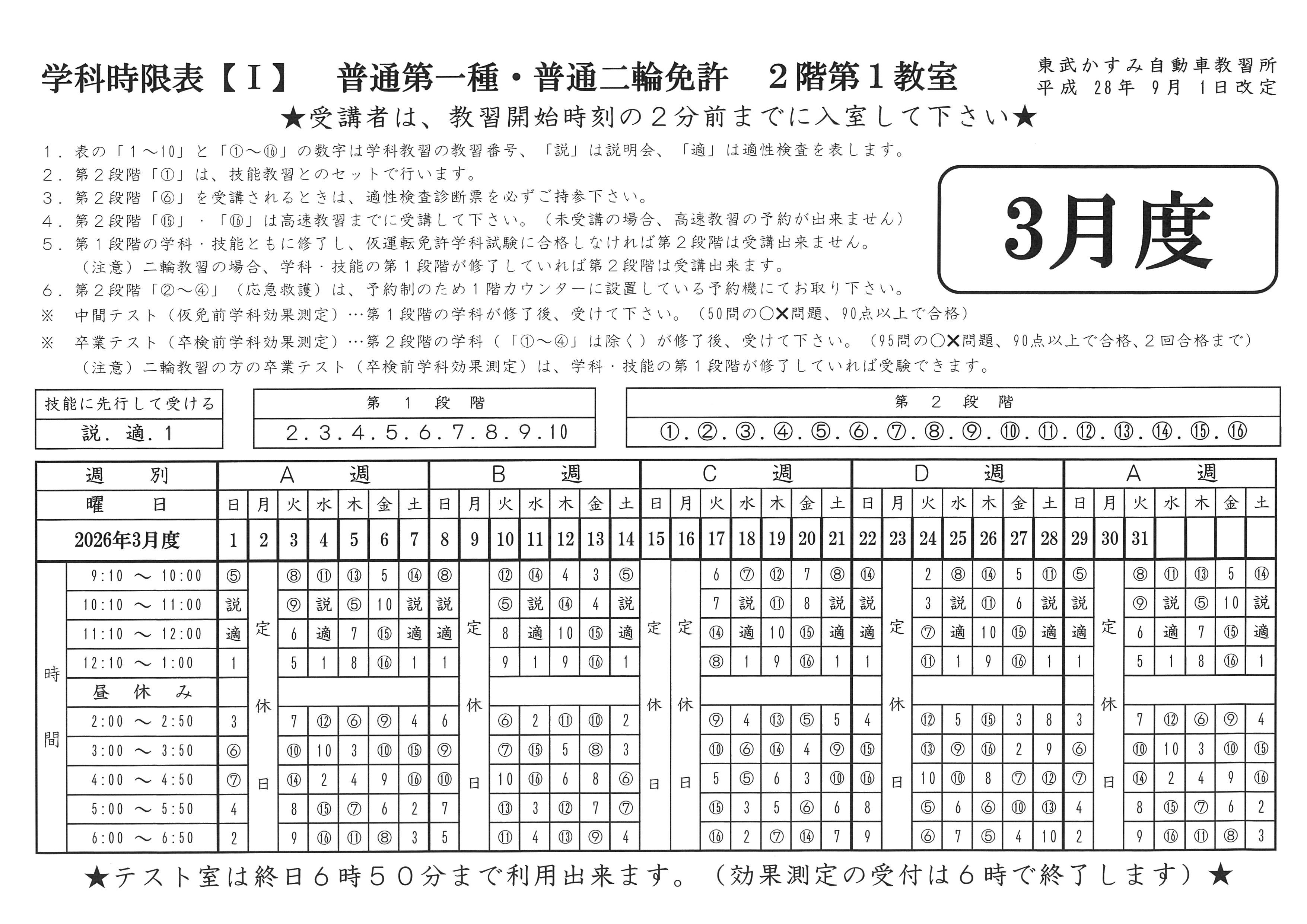 1. 表の「1~10」と「①~⑯」の数字は学科教習の教習番号、「説」は説明会、「適」は適性検査を表します。