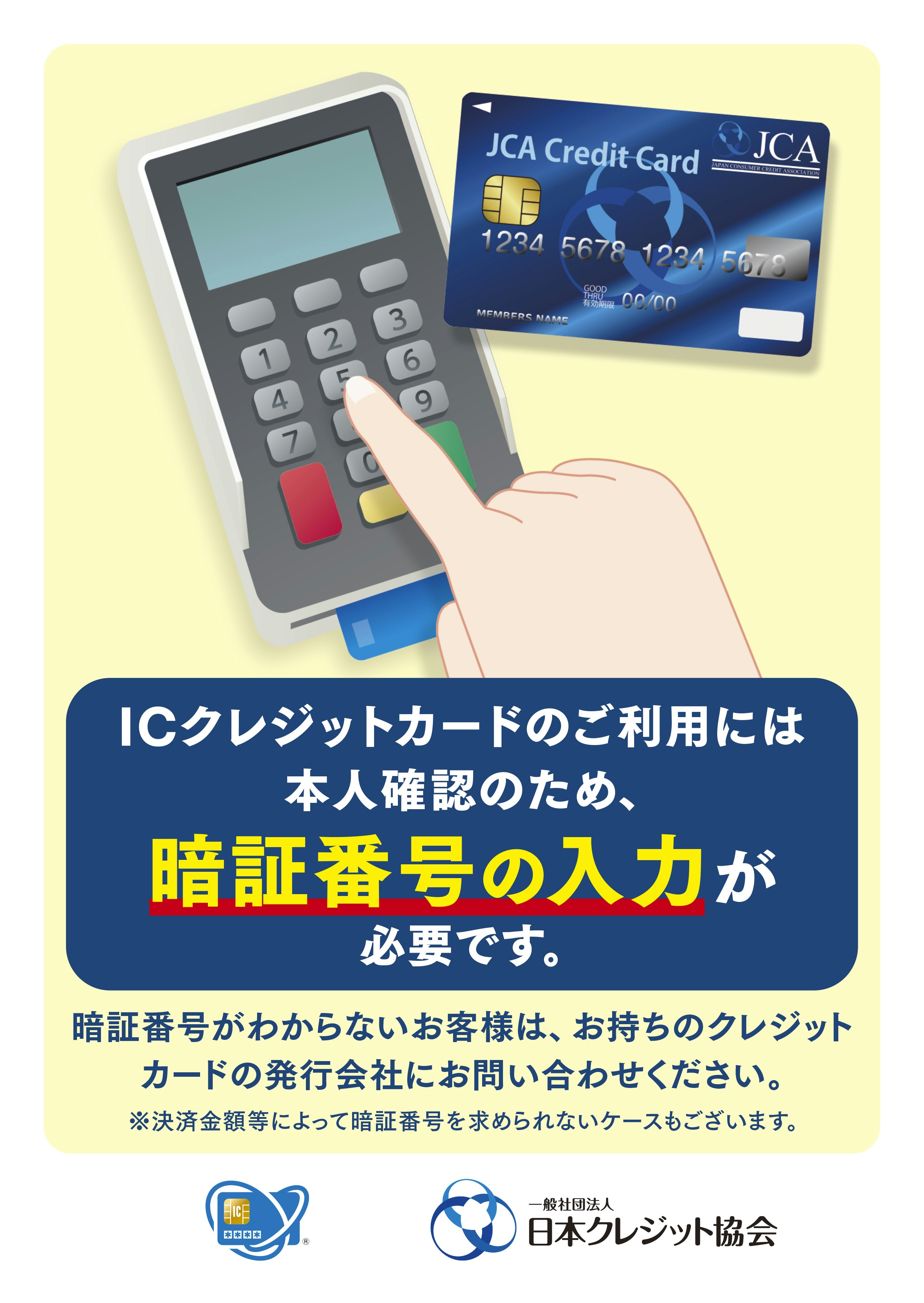 2025.10.20 暗証番号が必要なICクレジットカード決済について JCCA(日本クレジットカード協会)が公表しているクレジットカード・セキュリティガイドラインに伴い、 2025年4月以降、ICクレジットカードのご利用には本人確認のため、暗証番号の入力が必要となりました。暗証番号がわからないお客様は、お持ちのクレジット カードの発行会社にお問い合わせください。 ※決済金額等によって暗証番号を求められないケースもございます。なお、詳しくは「こちら」をご覧ください。 一覧にもどる