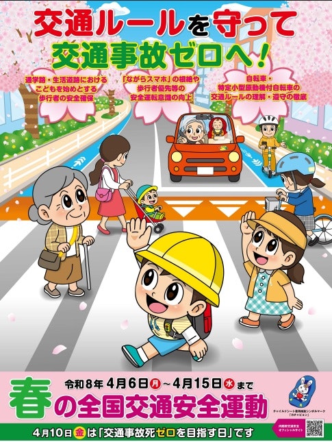 本運動は、広く県民に交通安全思想の普及・浸透を図り、交通ルールの遵守と正しい交通マナーの実践を習慣付けることとともに、国民自身による道路交通環境の改善に向けた取組を推進することにより、交通事故防止の徹底を図ることを目的とし、2026年4月6日(月)から4月15日(水)までの10日間実施されます。